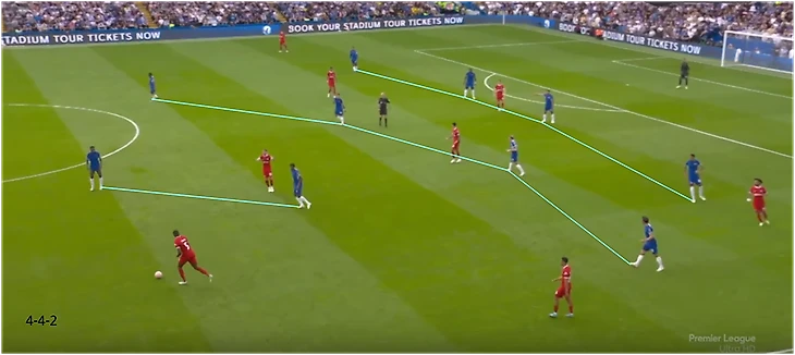 Начнем с предсезонной подготовки из пяти летних матчей во всех начинали с четверкой защитников, но в первом туре перешли на тройку центральных. В тех играх Почеттино пробовал схему 4-2-3-1, где в двойке опорных появлялся Андре Сантос, но его отдали в аренду Ноттингему Форест 25.08. Кристофер Нкунку за десять дней до старта сезона получил травму 03.08. «Челси» вкатился в сезон без разыгрывающего плеймейкера, ожидая более качественных игроков и без игрока способного находить пространство между линиями и отдавать последний пас из последней трети (хотя еще вопрос нужен ли такой или нет, но судя по проблемам в позиционной атаке, мог бы пригодиться).