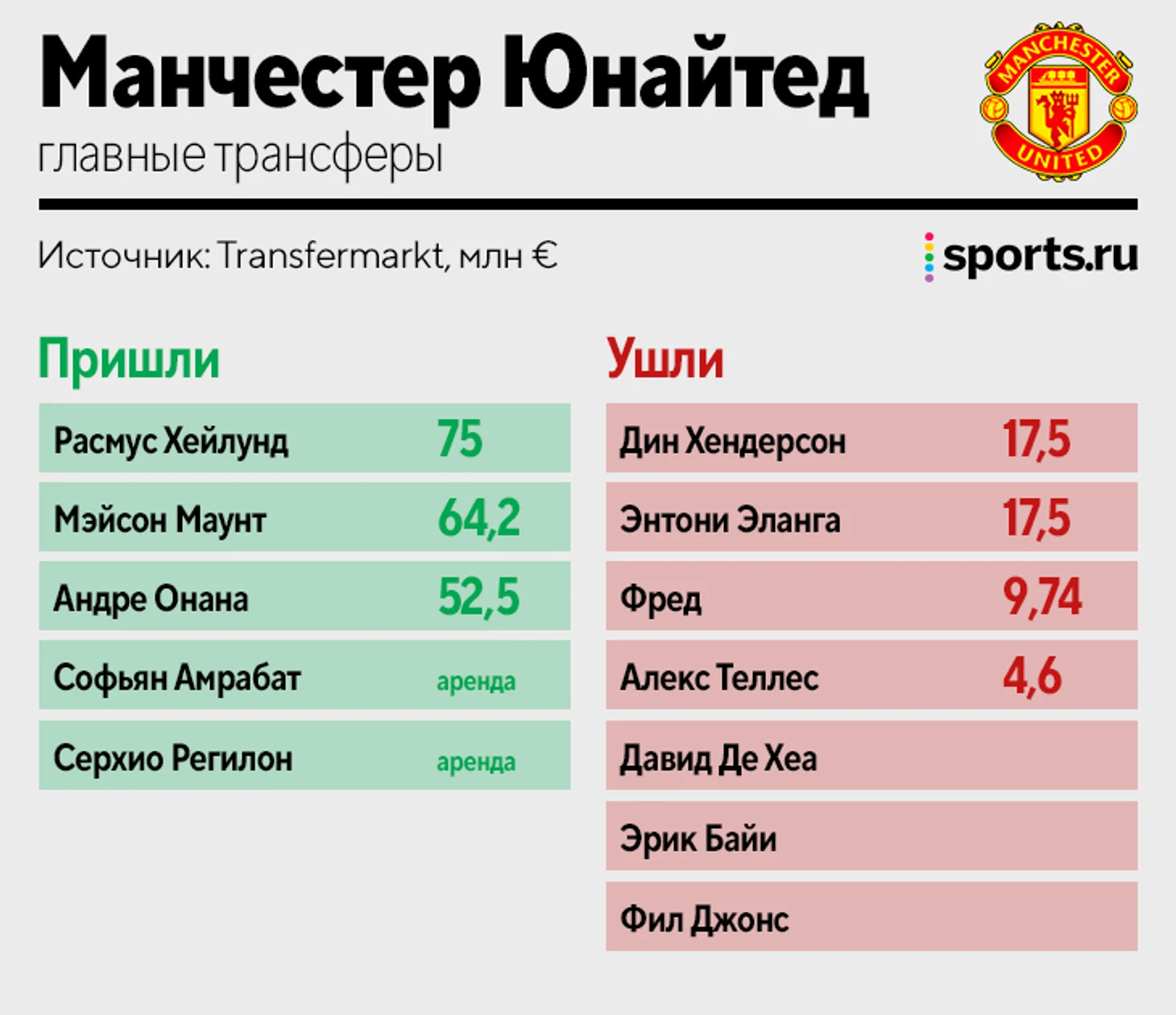 Каким получилось трансферное окно: на секунду показалось, что «Юнайтед» возьмет футболистов на ключевые позиции до старта предсезонки. Получилось ровно наполовину: сделку по Маунту быстро закрыли, Онана приехал в первые дни зарубежного тура. Хейлунда купили в начале августа, но из-за травмы он только недавно полноценно втянулся.