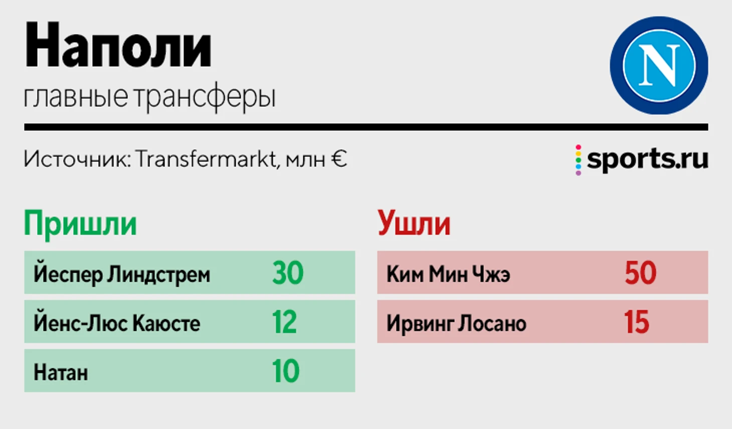 Каким получилось трансферное окно: слабым. Неаполитанцы рискнули и привезли малоизвестного бразильца на место фундаментально важного центрального защитника. Возможно, со временем из Натана выйдет толк. Но сейчас он проигрывает конкуренцию Жезусу, и это приговор неаполитанскому рынку без спортдира Джунтоли. Еще больший приговор – что Жезус теперь основной игрок.