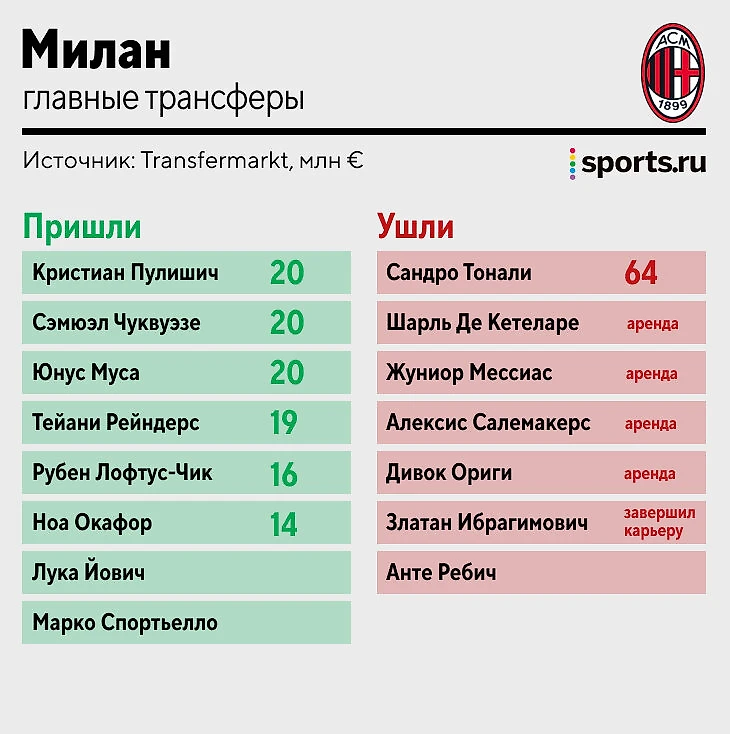 Каким получилось трансферное окно: сильным. Миланцы достигли почти всех целей. Подвела только позиция правого защитника: клуб снова вошел в сезон с двумя травматичными игроками – сложно поверить, что ни разу не возникнет ситуация, когда Флоренци и Калабрия одновременно окажутся недоступны. Понятно, что есть Калулу, но он сильнее в центре.