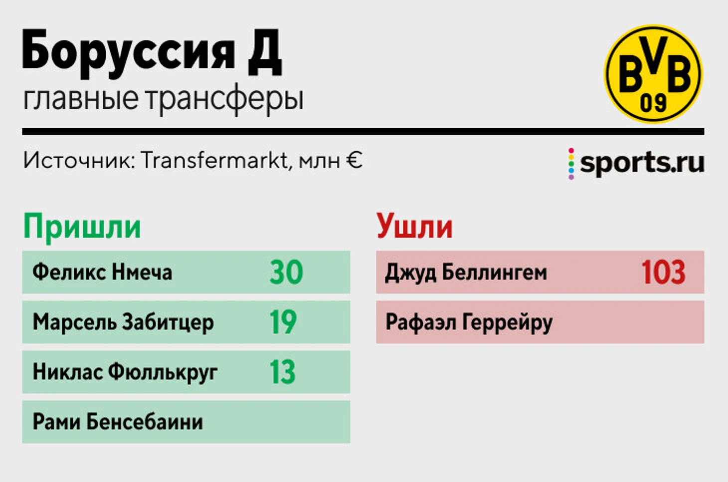 «Боруссия» быстро продала Беллингема в «Реал» за фиксированные 103 млн – по итогам трансферного окна сумма кажется не очень большой. Столь же быстро из «Дортмунда» в «Баварию» свободным агентом ушел Рафаэл Геррейру. Так «Дортмунд» остался без двух очень важных игроков, чье исчезновение нужно было восполнить новичками.