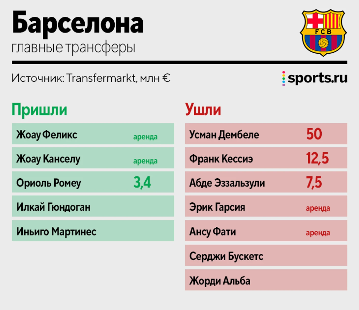 Каким получилось трансферное окно: «Барса» провела хорошее лето. За копейки нашла топ-игроков на нужные места, хотя трансферы Канселу и Феликса пока выглядят спорно. И все же: Лапорта на них не потратил ни копейки, оба пришли в аренду, почему бы и нет?
