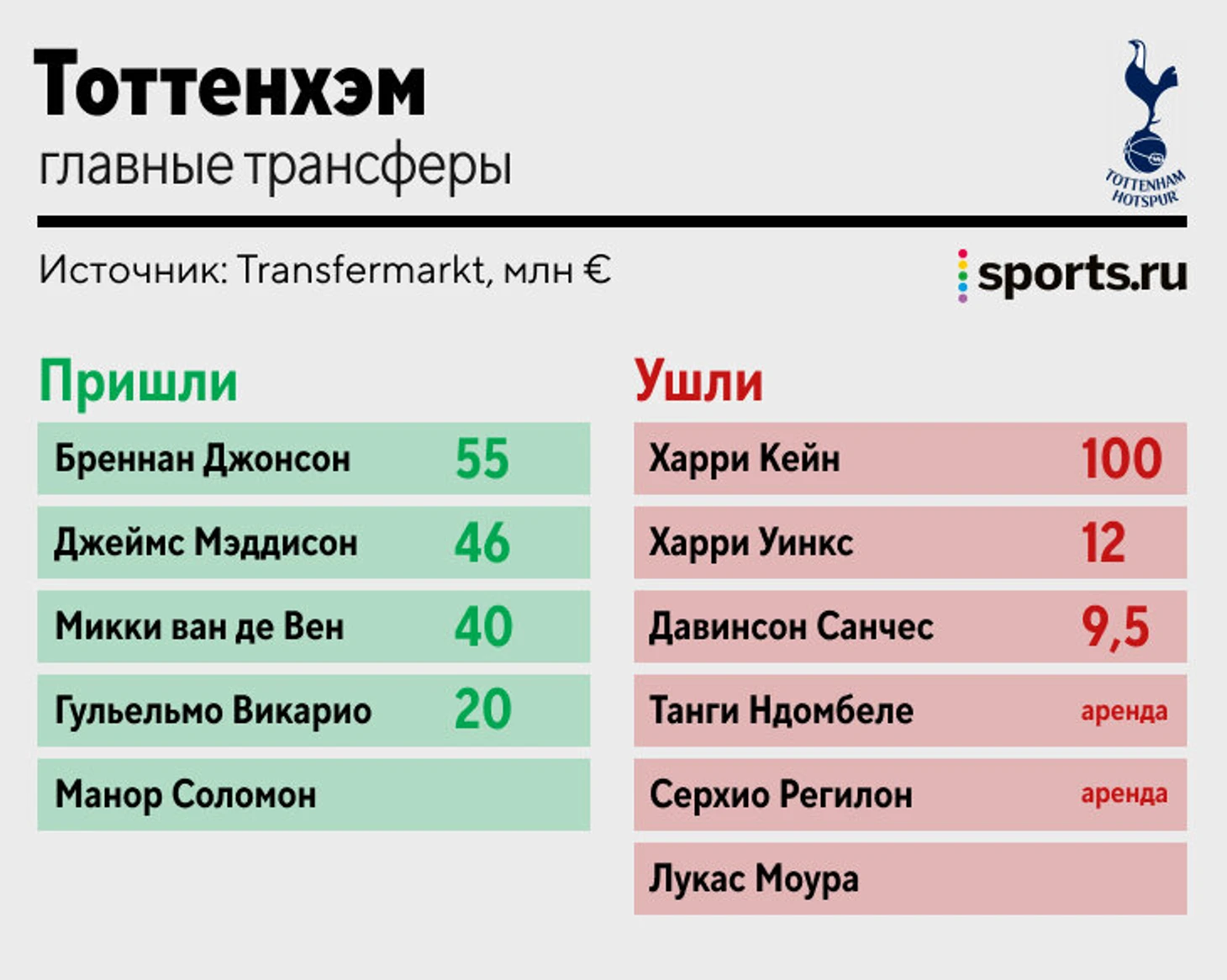 Все три трансфера оформили до продажи Харри Кейна в «Баварию». Заменить его голы – безусловно, вызов, но «шпоры» оригинально подошли к вопросу. Прямой альтернативы фактически нет. Сейчас у Постекоглу три варианта: уже имевшиеся в распоряжении Ришарлисон, Сон и купленный из «Ноттингема» Бреннан Джонсон. Ни один не похож на Кейна – компенсировать продажу попробуют через стиль. В этом есть смысл: Харри – нападающий слишком редкого набора данных, чтобы даже задумываться о замене лоб в лоб.