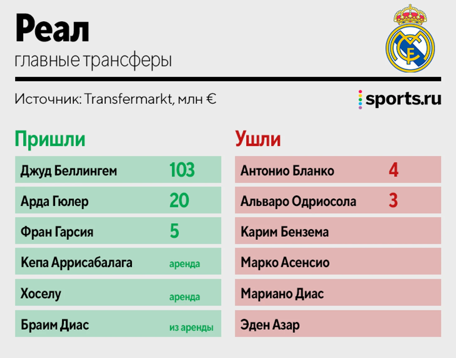 Чего не хватает, чтобы считать кампанию совсем идеальной? Более четкой реакции на уход Карима Бензема. «Реал» не форсировал переход Килиана Мбаппе и не купил другого топ-нападающего. Это точно не катастрофа, учитывая, что у Карло Анчелотти есть новая схема с ромбом. Наоборот, кажется тонким решением, которое может сэкономить кучу денег (именно поэтому оценка все равно предельно высокая). Но элементы проблемы в этом рассмотреть можно: на неординарное решение делается слишком большая ставка – «Реал Мадрид» купил лучшие яйца по хорошей цене, но сложил их в одну корзину.