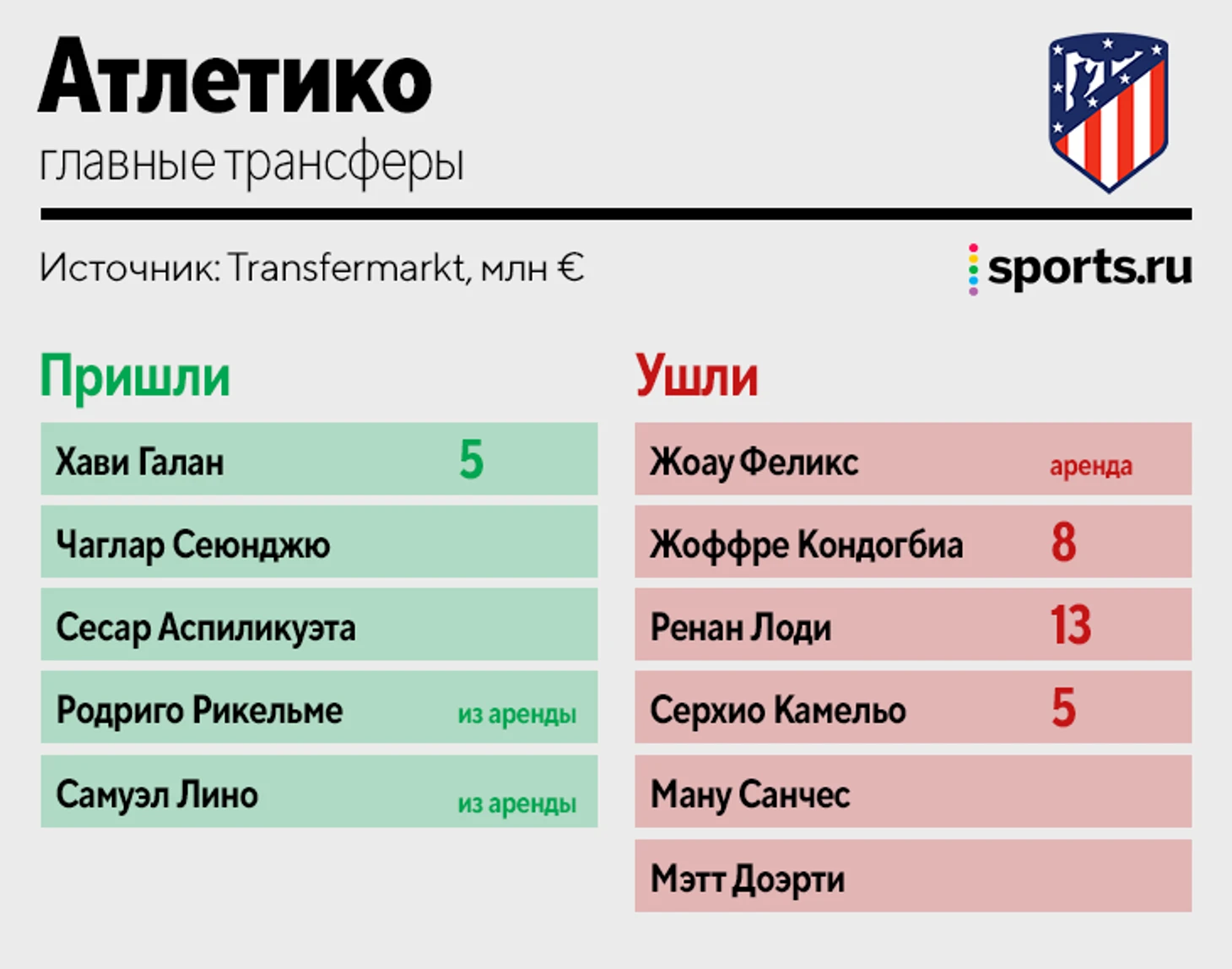 Удалось слить Жоау Феликса, его зарплату полностью взяла «Барса». Продали Ренана Лоди, который ругался с Симеоне. Неплохо заработали на 30-летнем Карраско. Да и 50 млн от «Вулвз» за форварда Матеуса Кунью – огромный успех. «Атлетико» не потерял ни одного лидера, кроме Карраско, но тому оперативно нашли замену.