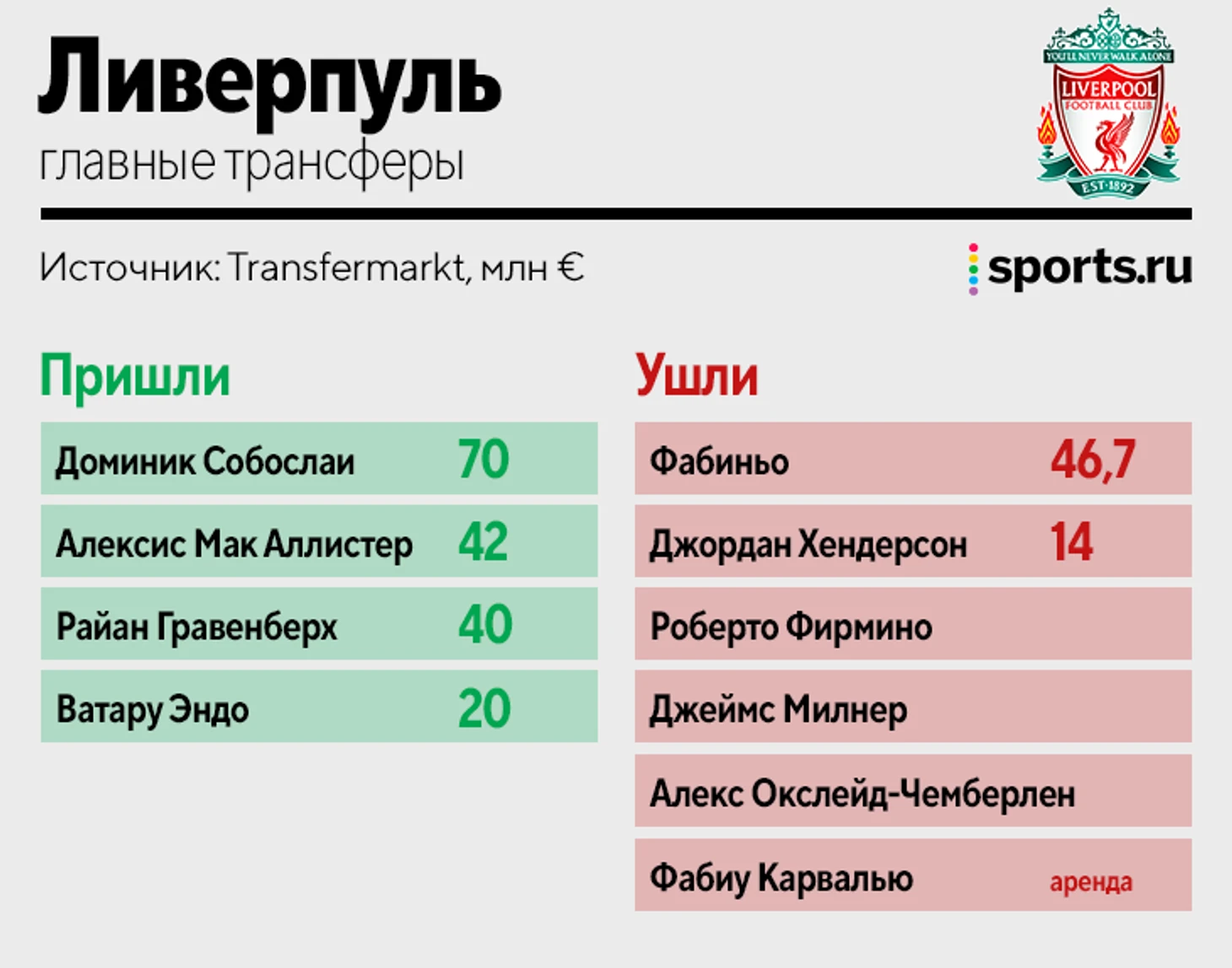 Каким получилось трансферное окно: очень странным. Именно так. Категории «плохое» или «хорошее» не подходят. В первый месяц «Ливерпуль» шел на 10-ку. Оперативно оформили переходы Алексиса Мак Аллистера и Доминика Собослая. Идеальные игроки в систему Юргена Клоппа. В кризисную по прошлому сезону зону. Приходят до начала предсезонки.