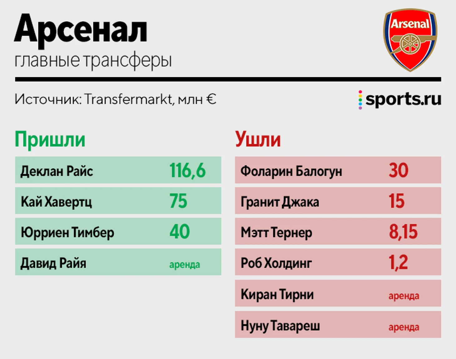 Это именно точечная критика на фоне очень высокой планки. Стилистически игроки вполне подходящие (пускай неприлично дорогие, кроме Райи). Просто пока прошлогодний стартовый состав явно лучше нового сочетания с Райсом и Хавертцом. Оптимизм можно черпать из потенциала, который проявится по мере адаптации и развития футболистов. Ну и факт усиления глубины тоже радует.