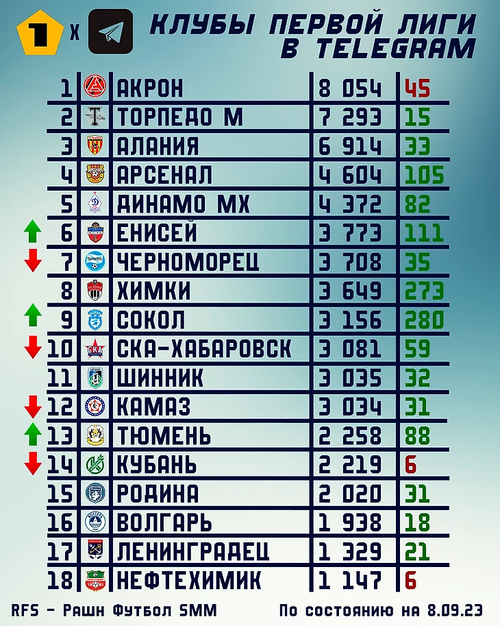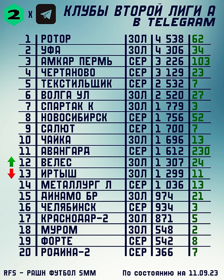 Всем привет. На связи всё так же RFS - Рашн Футбол SMM, я - всё так же Денис Каримов, всё так же - SMM-щик «Пари НН». И, что самое главное, у меня всё так же есть Telegram, в котором мы раз в неделю замеряем рост/отписки в телегах российских клубов из разных лиг. Здесь же всё будет в одном месте, с поправкой на то, что замер РПЛ делается в четверг, Первой лиги - в пятницу, а Второй лиги А - в понедельник.