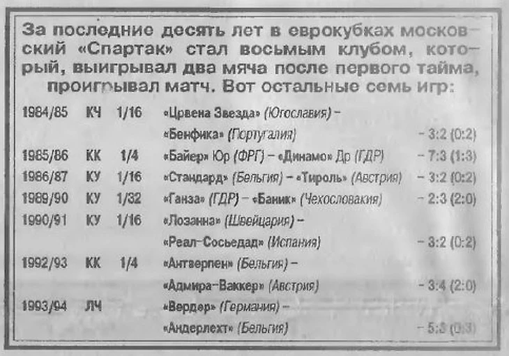 Кстати, в ответном матче «Спартак» выиграл 1:0, и это последняя победа красно-белых над извечным соперником в официальных матчах. В 2008 году команды сыграли в квалификации ЛЧ, и москвичи под руководством Станислава Черчесова два раза проиграли киевлянам по 1:4.