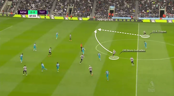 Это позволяет ему считать огромное пространство на правом фланге. Он элегантно играет в касание с полу-лета и выводит Кирана Триппьера и «Ньюкасл» вперед.