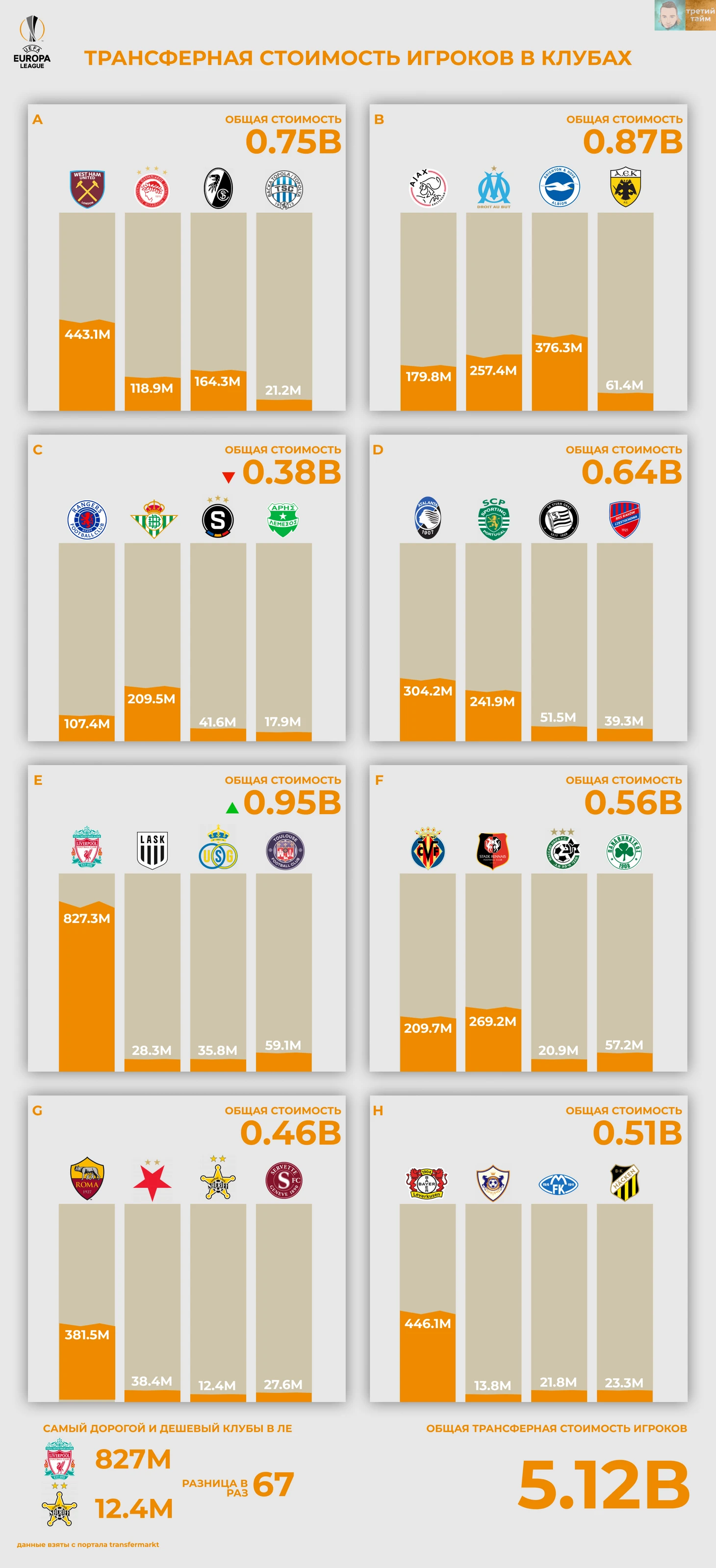 Трансферная стоимость футболистов Лиги Европы более чем в два раза меньше Лиги Чемпионов. Составляет 5,12 млрд. евро. Три Английских клуба («Ливерпуль», «Вест Хэм» и «Брайтон») вносят большой вклад в эту сумму. «Ливерпуль» делает свою группу Е самой дорогой, что логично. Никто и близко не может соперничать с европейским грандом в этом розыгрыше Лиги Европы. Стоимость группы Е - 0,95 млрд. евро. Почти как в группе Е Лиги Чемпионов, но есть нюанс, в ЛЧ эта группа самая скромная по стоимости.