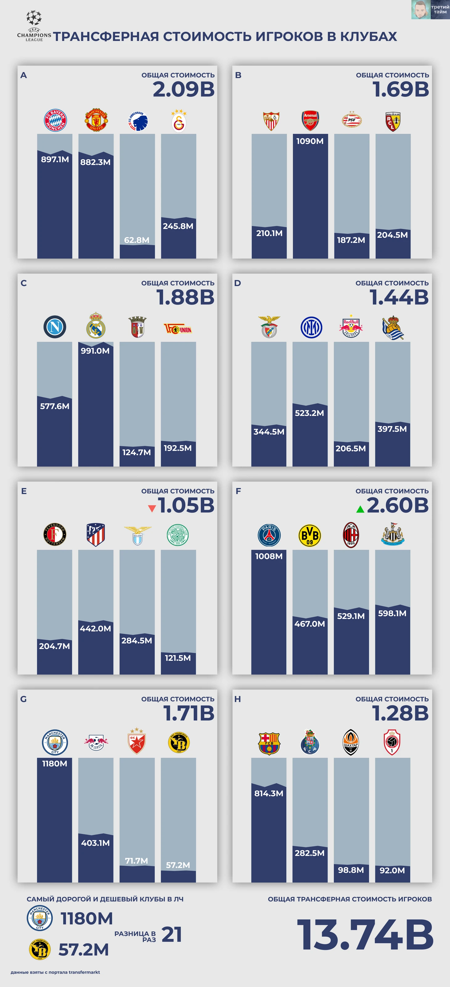 Ну а самый скромные по стоимости составы в группе В, где собрались «Гент», «Маккаби» Тель-Авив, «Заря» Луганск и «Брейдаблик» из Исландии. К слову, стоимость состава у него 2,9 млн. евро. А стоимость всей группы всего 0,11 млрд. евро. Условный «Селтик» собрал состав на 0,12 млрд. евро в этом сезоне. Вот такой футбол разный.