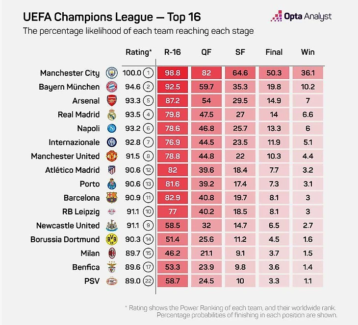 • «Арсенал» занял третью строчку – шанс, что Артета возьмёт трофей, равен 7%. Явный фаворит (как и все последние сезоны) – «Ман Сити» (36,1% на победу). «Бавария» – на втором месте: шансов чуть больше, чем у «Арсенала» – 10,2%. В целом прогноз выглядит очень странно. Бесспорно только по «Сити», а так смотрите сами: • Шанс «Наполи» на победу почти такой же, как у «Реала» – хотя из Неаполя ушли Спаллетти и важнейший защитник Ким Мин Чжэ. Такое ощущение, что в этом случае учитываются просто заслуги за прошлый сезон, но при этом: • У «Юнайтед» шансов выиграть ЛЧ больше, чем у чемпиона Испании – «Барселоны». Да даже у «Атлетико» (финишировали на 3-м месте в Ла Лиги) процент выше. • Такое ощущение, что «Барсу» здесь просто загасили. Потому что даже у «Порту» (!) шансов выиграть «ушастого» чуть-чуть больше... • Интересно, почему в списке нет ПСЖ. Получается, компьютер тупо выкинул Париж из 16 лучших клубов. Хотя там избавились от Неймара/Месси и вроде наладили атмосферу в команде. Плюс французы оформили хорошие трансферы и вернули Мбаппе. • При этом в топ-16 есть ПСВ, «Бенфика» и «Лейпциг». И все три клуба, которые как раз в одной группе с ПСЖ. Пишите в комменты своё мнение!