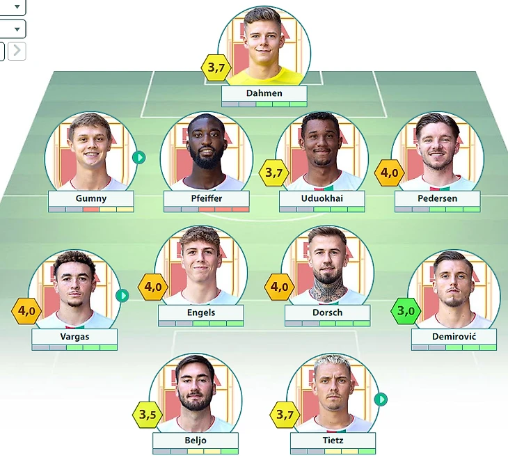 «Аугсбург» : Дамен – Энгельс, Бауэр, Удуохай, Педерсен – Варгас, Реджбечай, Дорш, Демирович – Бельо, Титц