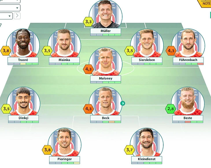 «Хайденхайм» : Мюллер – Траоре, Майнка, Зирслебен, Ференбах – Мэлоуни – Динкчи, Бек, Бесте – Пирингер, Кляйндинст