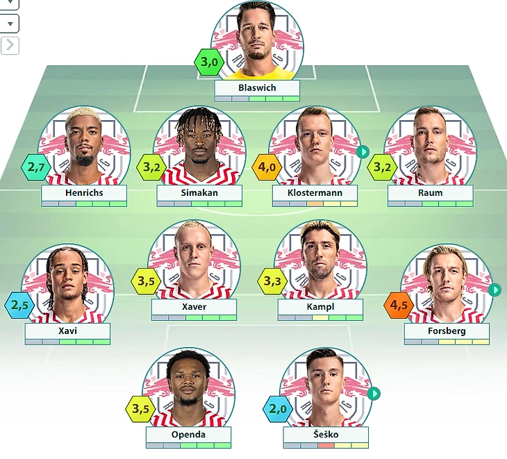 «РБ Лейпциг» : Бласвих – Хенрикс, Симакан, Клостерманн, Раум – Симонс, Шлагер, Кампль, Форсберг – Опенда, Шешко