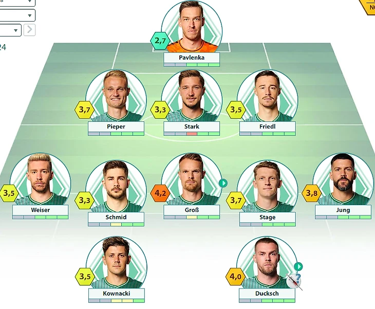 «Вердер» : Павленка – Пипер, Штарк, Фридль – Вайзер, Шмид, Гросс, Стаге, Юнг – Ковнацки, Дукш