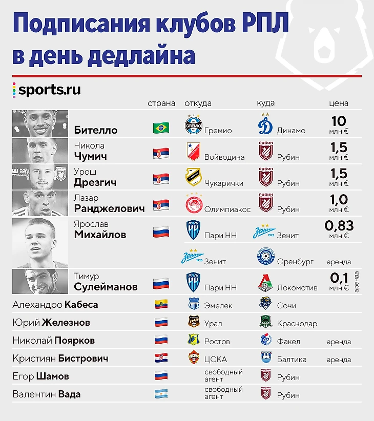 ● «Рубин» расширил этот список пятью подписаниями в день дедлайна: два имени нам уже знакомы, Ранджелович по «Уралу», а Шамов – по тульскому «Арсеналу». Еще за двоих сербов заплатили по полтора миллиона, а аргентинца с опытом игры в Лиге 1 за «Бордо» и испанских клубах взяли свободным агентом.