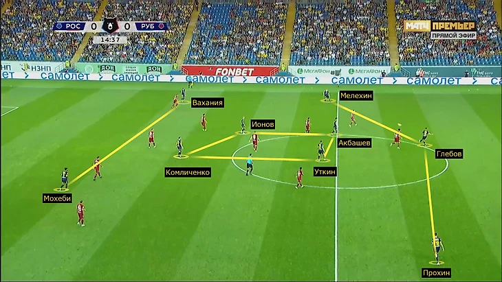 Против «Рубина» «Ростов» чаще владел мячом уже в середине поля, поэтому Глебов регулярно оставался между центральными защитниками, которые сдвигались к флангам. Из-за этого Акбашев уходил на одну линию к Уткину, а смещение восьмерки компенсировал Ионов – он спускался к Комличенко для подыгрыша.
