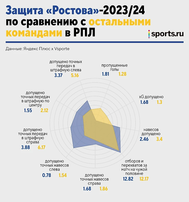 Ниже – красноречивый оборонительный радар «Ростова» по сравнению с остальными командами РПЛ. Очевидны большие проблемы сзади: пропускают даже больше, чем создают соперники (моментов тоже много – 12-е по качеству допущенных шансов), позволяют навешивать и плохо предотвращают кроссы в штрафную.