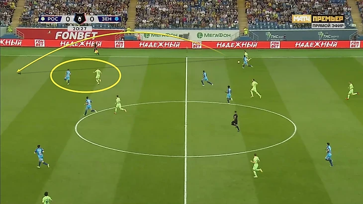 Теперь «Ростов» использует блок 4-2 (отличие от прошлого сезона – крайние защитники остаются на своей половине), Комличенко отходит в глубину (к нему поднимается одна из восьмерок – обычно Щетинин), а вингеры создают ширину (опять же – в отличие от прошлого сезона, когда они смещались к центру).