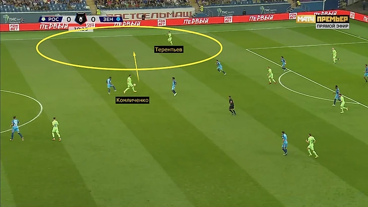 Этим воспользовался Песьяков. Сергей забросил на Комличенко – тот выманил Ренана из линии защитников и в касание скинул Терентьеву.