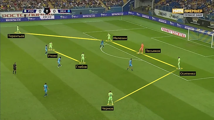 Без Осипенко «Ростов» просаживается в давлении, контрпрессинге и борьбе – Максим готов смело и качественно выбрасываться за соперниками в опорную зону. У Прохина, Мелехина и Терентьева с этим проблемы: они не так агрессивны и своевременны, могут остаться в глубине (тогда соперник еще и получает пространство для приема).