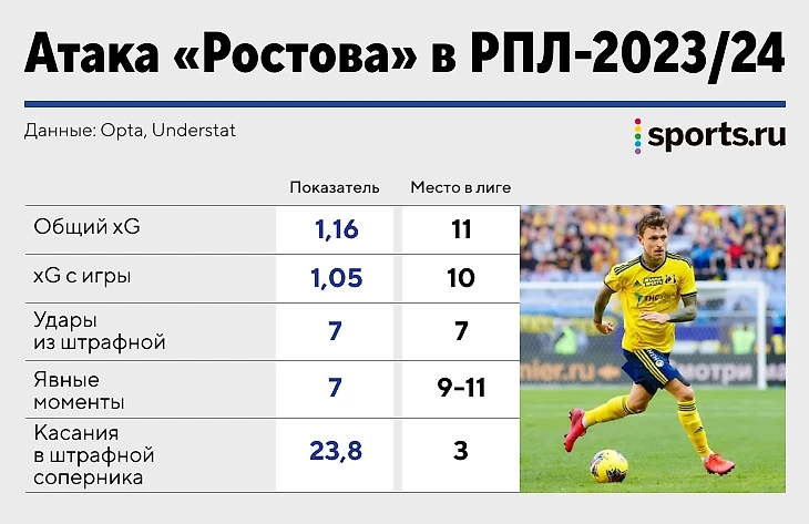 Нынешние результаты «Ростова» продолжают тенденции прошлого сезона: интересные идеи на мяче около своих ворот плюс ужас на чужой половине при четвертом владении в лиге (55,8%). Тогда разницу делали стандарты и пенальти, сейчас чит-код не срабатывает. «Ростов» умудряется входить в топ-3 РПЛ по касаниям в штрафной, но в середине таблицы – по ударам из нее. Еще хуже с угрозой воротам: «Ростов» во второй восьмерке по конвертации моментов.