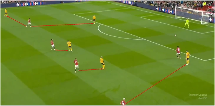На видео 2 видно для чего используют ложного фулбэка, Педро Порро создал численный перевес и Алехандро Гарначо не успел перекрыть линию паса. Такие опасные проходы прессинга могут дорого стоить МЮ.