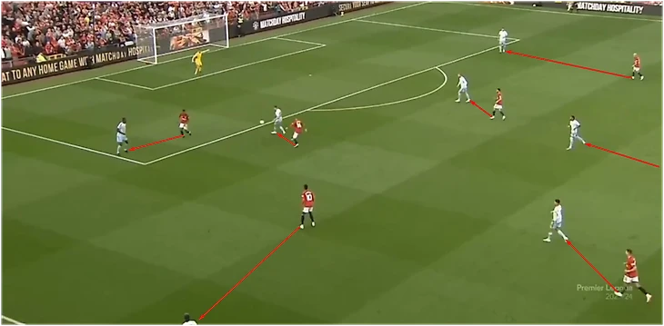 Одна из самых громких претензий к тренерскому штабу - это провалы в центре с последующими стремительными контратаками на ворота Андре Онана. Чтобы понять, как такое безобразие допускается нужно разобрать то, как МЮ прессингует, потому что после прессинга или неудачного контрпрессинга через оголенный центр соперники выбегают.