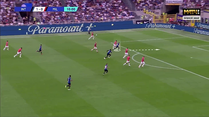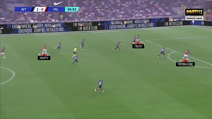 «Милан» смело прессинговал. Чтобы поддерживать давление, четверка защитников предельно плотно (часто вообще персонально) выдвигалась на четверку «Интера» – Думфрис, Тюрам, Лаутаро, Димарко. В стадии розыгрыша они располагались выше остальных игроков «Интера», практически образуя четверку атаки.