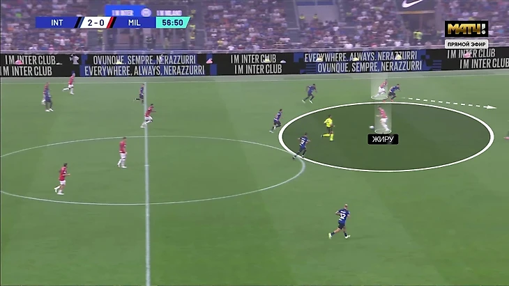 Во-вторых, хорошо видна дилемма, которая встает перед центральным защитником. Либо идти до упора и ломать оборонительную линию, либо остаться в линии и дать свободу сопернику. Ачерби полностью запутался. Выбрал худшее из возможных решений – начал движение за Жиру, но не пошел до конца. И линия сломалась, и оппонент получил свободу.