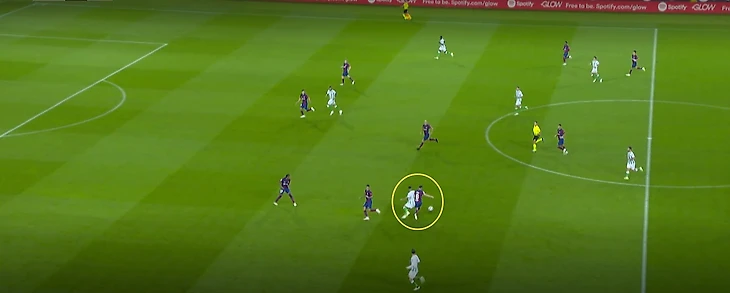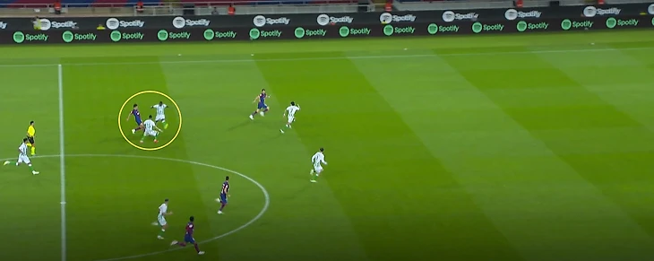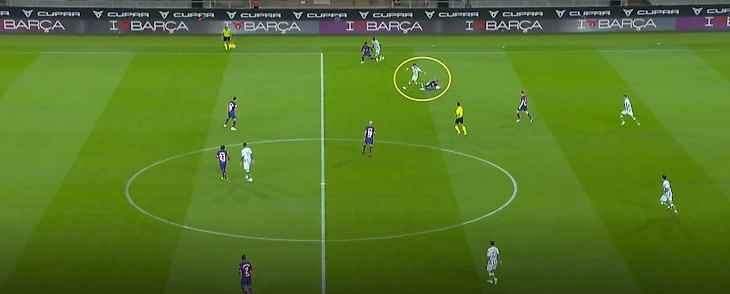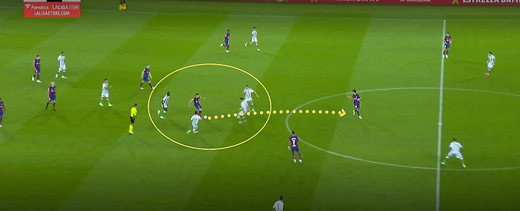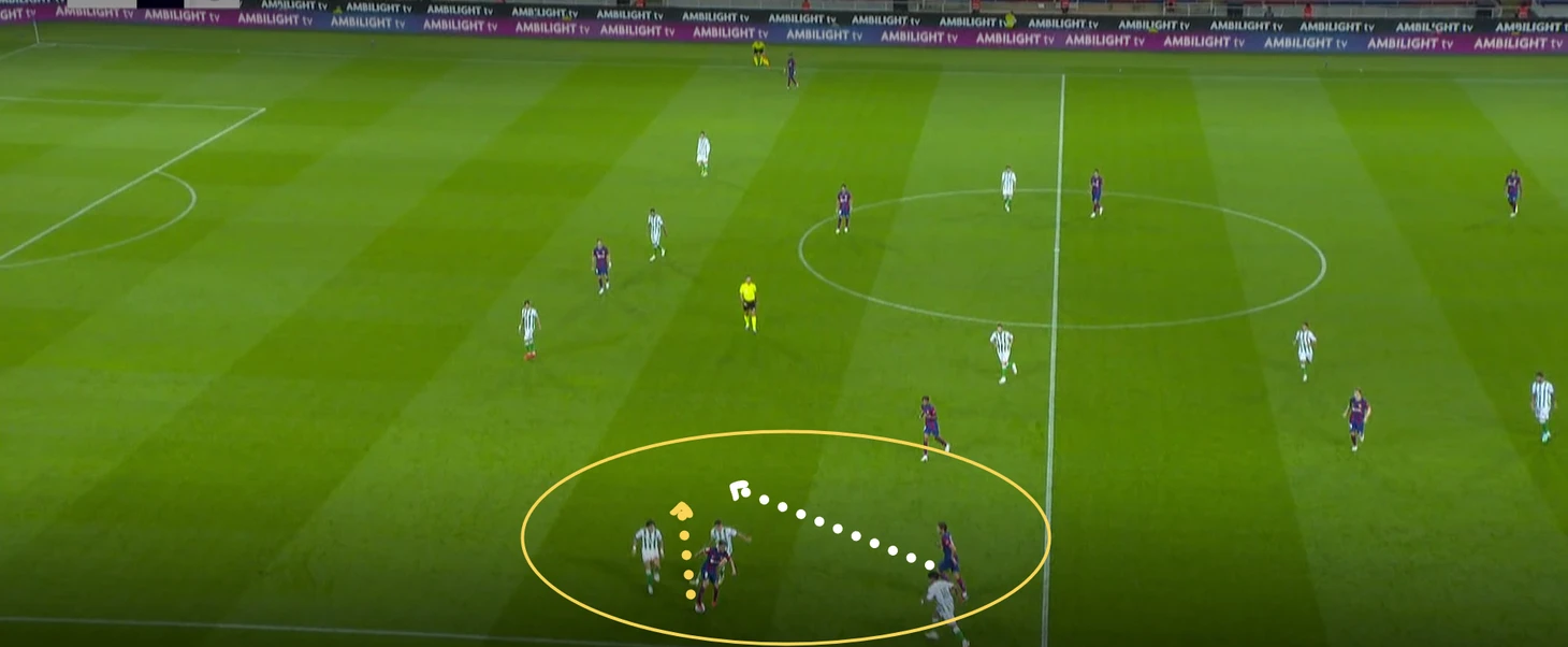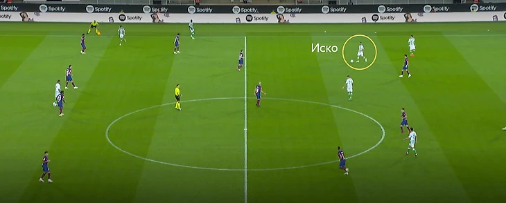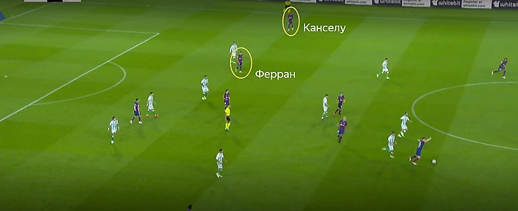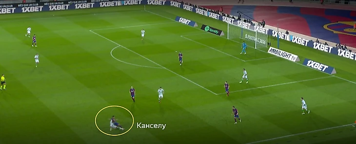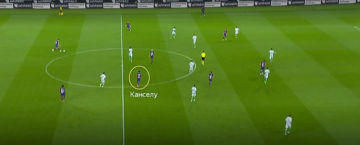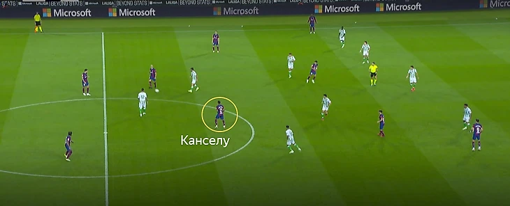 В большинстве случаев Канселу уходил в опорную зону и участвовал в атаках из глубины. Ширину создавал Ферран Торрес. Если обычно структура команды Хави в позиционной атаке выглядит как 3-2-5, то в матче с «Бетисом» структура была больше похожа на 2-3-5 с более высокой ролью Канселу.