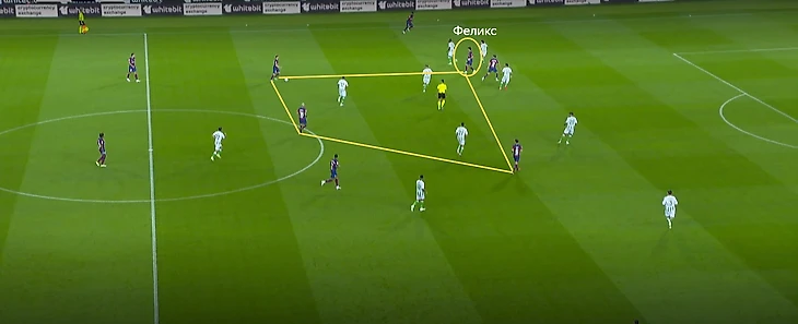 «Барса» вышла с привычным квадратом в центре поля. Гюндоган остался на скамейке – Хави не стал рисковать немцем после небольшого повреждения в сборной. Слева появился Феликс. Жоау комфортно себя чувствует в такой роли: ему удобно смещаться в центр под рабочую правую ногу.