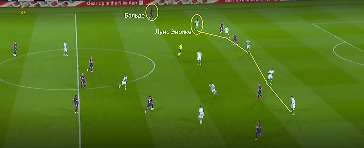 Иногда формация переходила на пятёрку защитника. Высокая позиция Бальде вынуждала Луиса Энрике (не того) садиться в оборонительную линию.