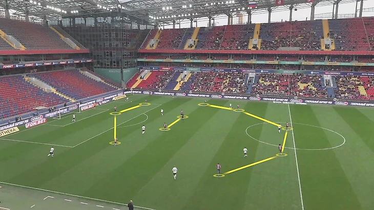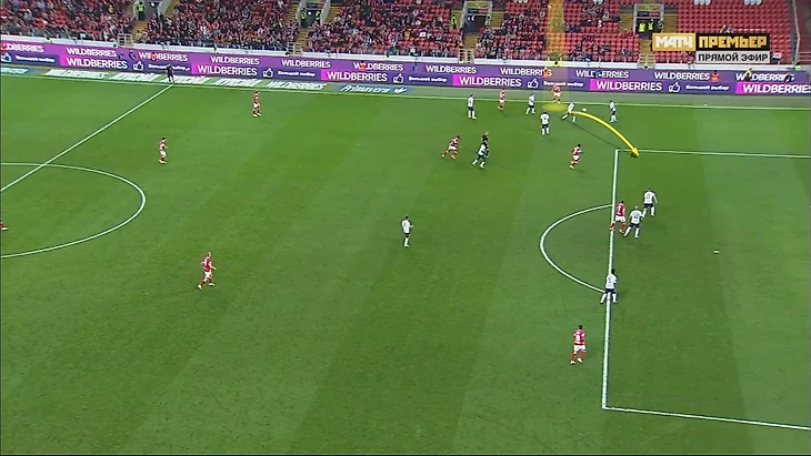 ЦСКА регулярно включается во фланговый прессинг. И часто так делает, если соперник пасует назад. Мы это видели в матче с «Зенитом» (тогда забили после третьей прессинг-попытки), с «Крыльями» хозяева тоже накрывали в начале матча – первый раз оборвали игру фолом.
