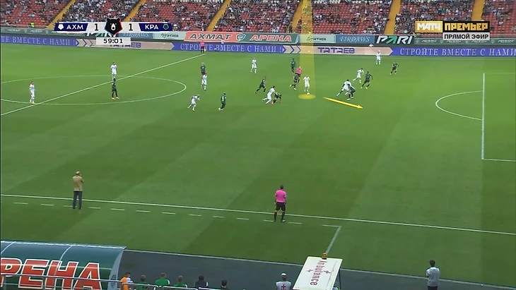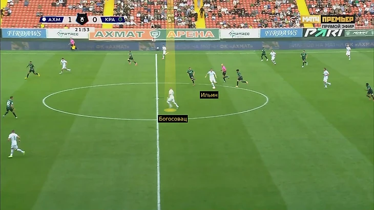 В середине первого тайма «Ахмат» выходил из-под прессинга «Краснодара» на правом фланге. Богосовац вовремя сместился в середину, создал численное преимущество для Ильина.