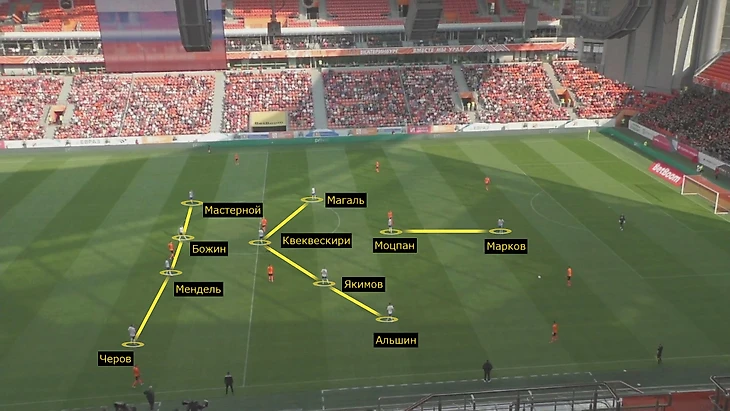 Ташуев в первой же игре перешел на 4-4-2: Божин/Мендель – пара ЦЗ, Мастерной – левый защитник (ранее в этом сезоне выходил справа), Черов – правый, Квеквескири и Якимов – опорники, Магаль – левый вингер (обычно считался универсальным латералем), Альшин – правый (в РПЛ выходил левым латералем), Моцпан в свободной роли в паре с Марковым, хотя Хызыр Аппаев раньше считался незаменимым.