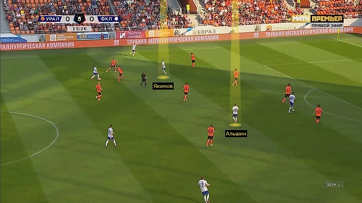 О прессинге судить сложно, потому что «Урал» при малейшей угрозе переходит на длинные передачи, но при владении соперника «Факел» заужает четверку полузащитников. Так Воронеж выбежал в опасный отрыв: сначала поджали слева, перехватили длинную передачу, после подбора Альшина в середине перевели мяч на чужую половину.