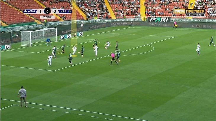 Теперь – очередь Ивана Башича. Наир Тикнизян после выхода Тимура Сулейманова остался один в этой зоне. Ему пытался помочь Даниил Куликов, но эпизод ужасен во всем: нулевая опека Переса, свободная опорная зона, странный ориентир Тимура на Арсена Адамова, хотя секундами ранее он пробегал около Башича – и никто не пытался блокировать.