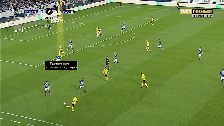 Хотя кое-что смущает и у самого «Ростова». После удачного дриблинга Энрикеса оказался отыгран Лангович, а остальная четверка защитников располагалась очень широко. Расстояния настолько большие, что «Балтика» численно превосходила защитников: Терентьев и Глебов в принципе далеко от адреса подачи, а между Мелехиным и Черновым сразу три соперника.