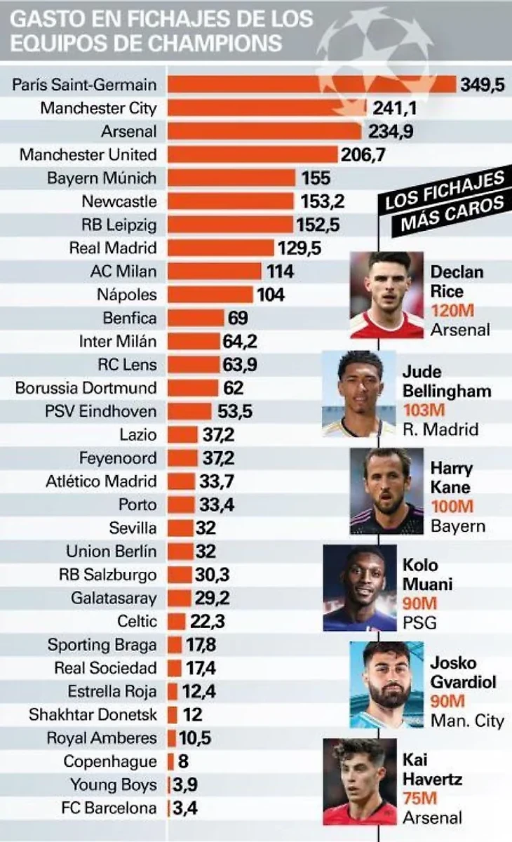 Отдельными дорогими трансферами выделяются «Бавария» и Харри Кейн − 100 млн евро, и «Мадрид» с Джудом Беллингемом − 103 млн евро.