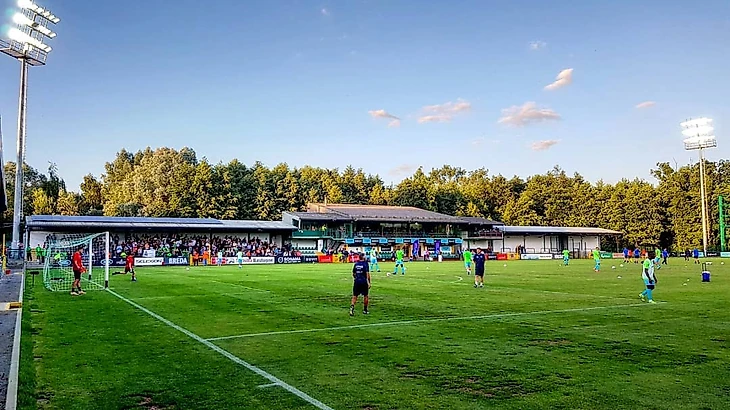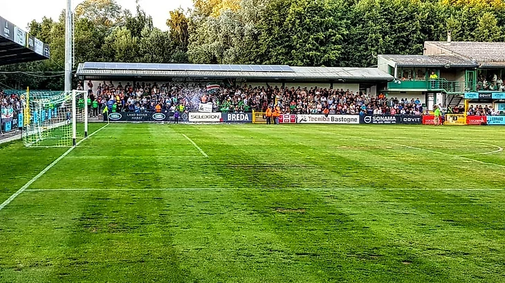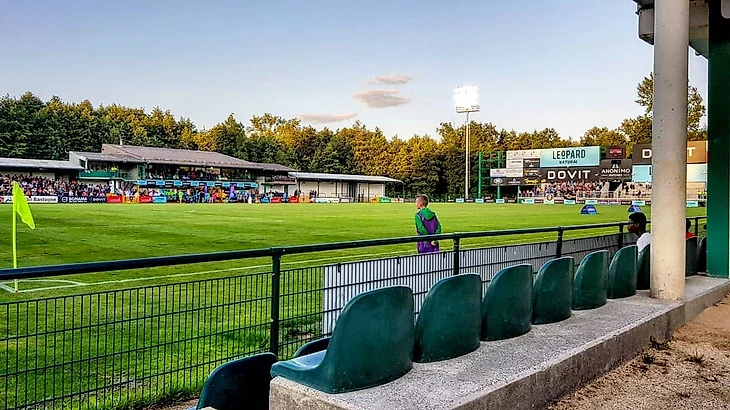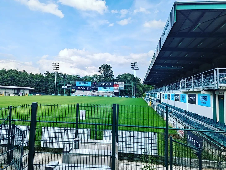 В третьем по силе дивизионе Бельгии особо за качеством газона не следят. Видны куски земли и неровности.