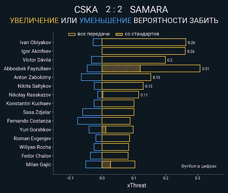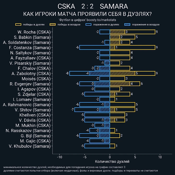 После удаления Виллиана Роши изменений в схеме не было и ЦСКА просто стал играть с 4 защитниками. Логично, что после этого забросов в сторону Заболотного стало ещё больше. Его оппонентом на втором этаже всегда был Евгеньев. По статистике единоборств видно: почти вся борьба в воздухе сводилась именно к этой дуэли.