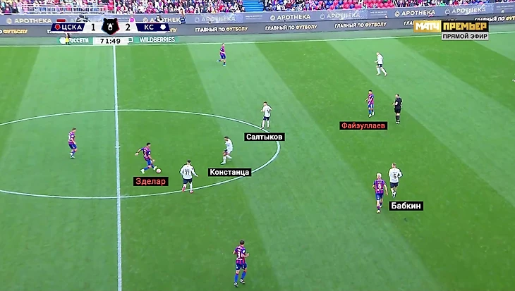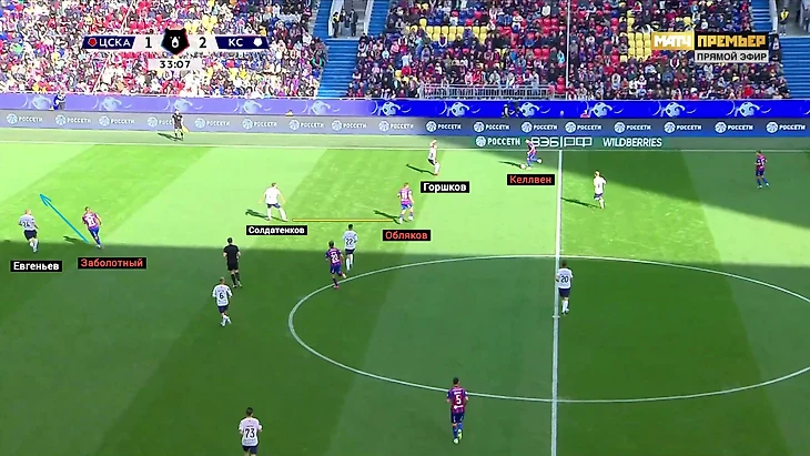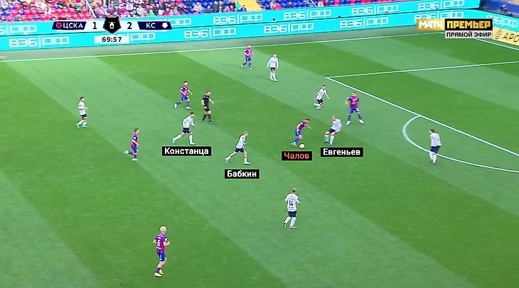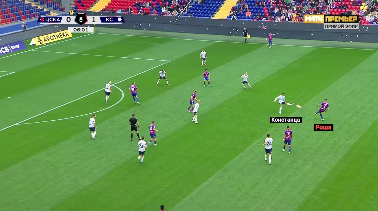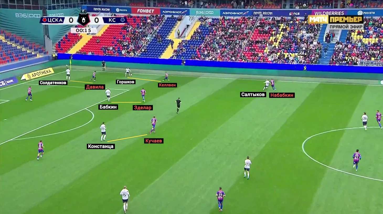 Благодаря тому, что на мяче команда Осинькина выстраивалась в 4-4-2, ЦСКА было не так удобно прессинговать персонально. Для давления на одного из центральных защитников к Заболотному должен был подниматься Давила или Обляков, а латераль на соответствующем фланге выдвигался на крайнего защитника. Когда такое происходило слева, гости активно использовали средние и длинные передачи на Салтыкова, который оказывался против Набабкина.