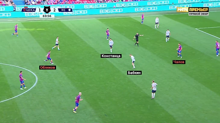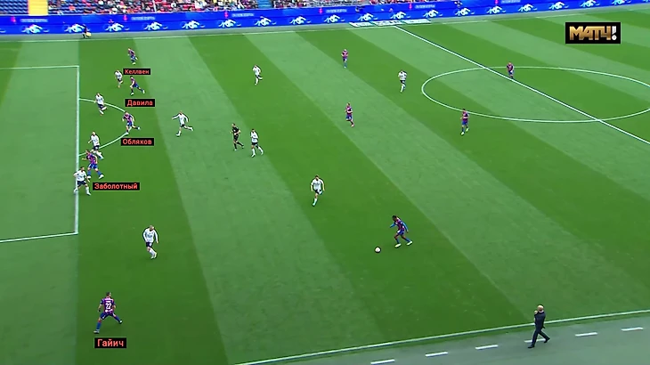После второго гола Владимир Федотов сразу поменял местами Облякова и Давилу. Теперь фланговые атакующие игроки ЦСКА реже бежали за спину, а больше смещались в губину, заставляя одного из защитников уходить за собой.