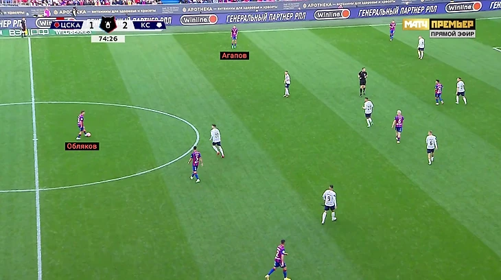 Всё чаще мы видели ситуации, когда во время позиционных атак Обляков становился центральным защитником, а Агапов уходил левее. Армейцам нужно было более качественно двигать мяч из этой позиции.