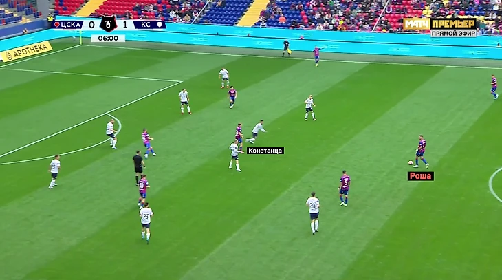 Вот ЦСКА в позиционной атаке, Роша находится в середине с мячом без давления. Фернандо начинает движение в сторону защитника.