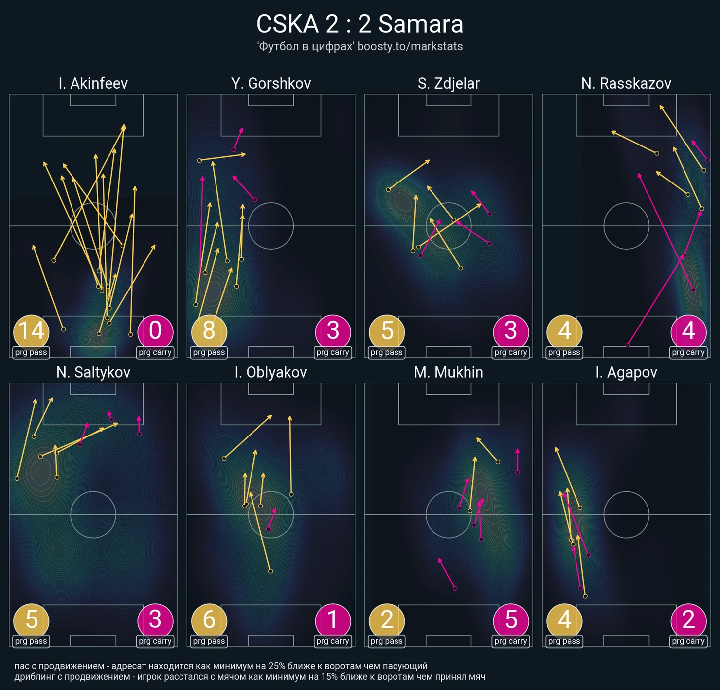 Так же армейцы стали разнообразнее впереди после замены Мойзеса. Бразилец здорово умеет тащить мяч вперёд со своей позиции, поэтому в первой половине тайма ЦСКА пытался обострять через левый фланг заметно больше. С выходом Агапова этот перекос исчез.