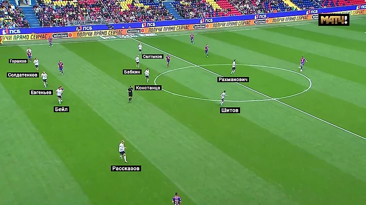 Но при игре без мяча команда трансформировалась. Осинькин решил обороняться по зеркальной схеме: Рассказов опускался пятым защитником (Бейл становился правым центральным), Шитов уходил на правый фланг, а Рахманович оставался единственным нападающим.